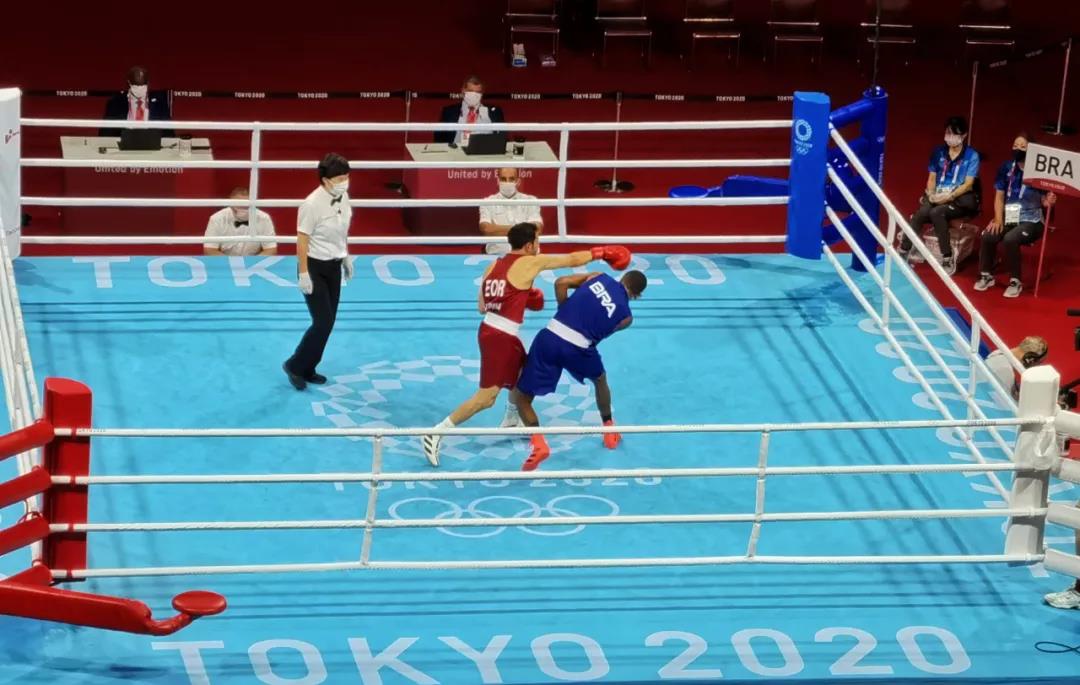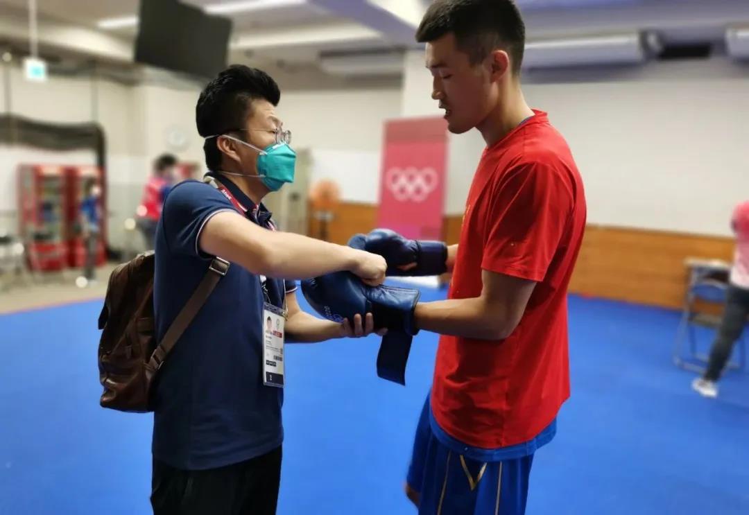 东京奥运会拳击热身馆,OD体育工作人员帮助运动员穿戴拳击手套