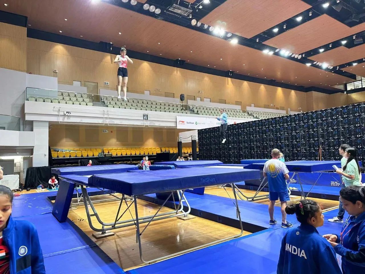 为服务好本届蹦床锦标赛,OD体育保障人员严格按照赛事服务手册开展工作,从场馆的规划布局、器材的安装调试、标准高度的校准、过程巡检等各个环节,一丝不苟、严谨细致,确保蹦床器材安装的准确无误,始终践行国际赛场上的中国标准,见证OD体育全领域规划、设计、制造、集成、运营、服务一站式解决方案的发展理念。